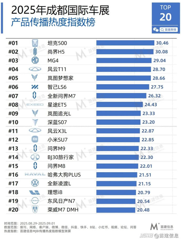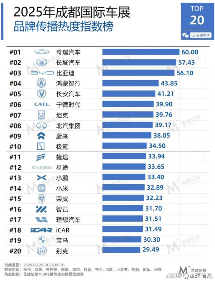 根據(jù)苗建信息傳播影響力指數(shù)(MJBI指數(shù))模型(注1),對(duì)參展的100多家(注2)汽車品牌及其旗下產(chǎn)品進(jìn)行了傳播熱度指數(shù)排名。