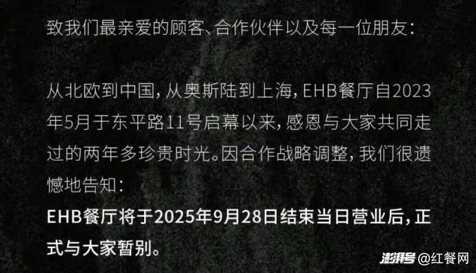 EHB餐廳在閉店公告中表示,此次“暫別并非終點(diǎn)”,未來期待以“全新形態(tài)”與大家再度相見。不過,截至發(fā)稿,官方尚未透露任何關(guān)于重啟計(jì)劃或經(jīng)營策略調(diào)整的具體細(xì)節(jié)。