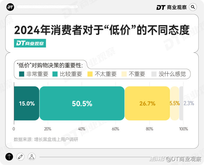 增長(zhǎng)黑盒的消費(fèi)者調(diào)查顯示,2024年有65.5%的消費(fèi)者認(rèn)為,“低價(jià)”在自己選購(gòu)商品的過(guò)程當(dāng)中扮演了比較重要或非常重要的角色。