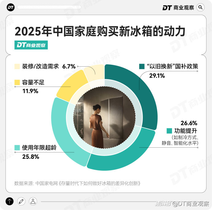 雖然真金白銀的補(bǔ)貼,刺激了人們的消費(fèi)意愿,但真到下單那一步,還是要看自己需不需要、綜合價(jià)值到底怎么樣。中國(guó)家電網(wǎng)消費(fèi)調(diào)研數(shù)據(jù)顯示,2025年消費(fèi)者更換冰箱的最大動(dòng)力,分別是國(guó)補(bǔ)“以舊換新”、功能提升、產(chǎn)品超年限和容量不足。