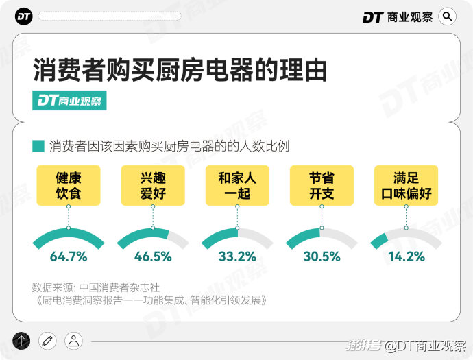 就以購(gòu)買廚房電器為例,有64.7%的消費(fèi)者因?yàn)椤敖】碉嬍场辟?gòu)買高品質(zhì)的廚房電器,只有30.5%的消費(fèi)者是因?yàn)楣?jié)省開(kāi)支而購(gòu)買廚電。原因在于,廚電的使用場(chǎng)景和生活安全、健康生活息息相關(guān),在這一品類上,健康可能是“第一需求”。