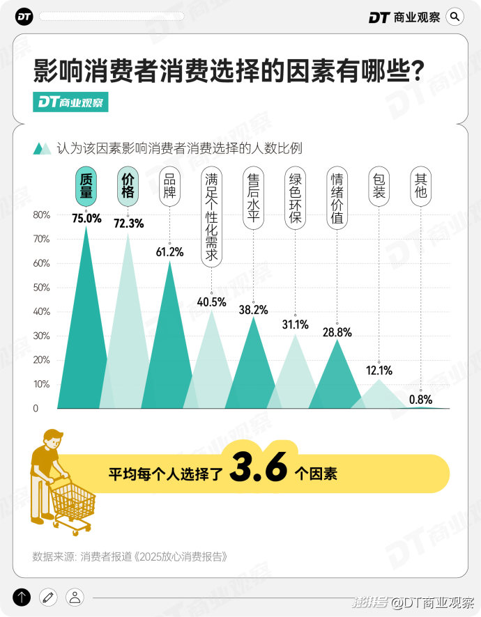 《消費(fèi)者報(bào)道》發(fā)布的《2025放心消費(fèi)報(bào)告》顯示,在影響消費(fèi)選擇的因素中,質(zhì)量(75.0%)和價(jià)格(72.3%)分列前兩位。平均每個(gè)人選擇了3.6個(gè)因素。