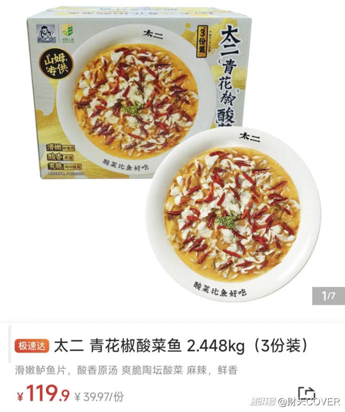 確實(shí),在山姆線上店就有太二青花椒酸菜魚在售,規(guī)格為2.448千克(3份裝),每份包含180克鱸魚片,附帶有油料包、酸菜包等,3份裝的售價(jià)為119.9元,保質(zhì)期12個月。消費(fèi)者購入后,解凍、清洗、加熱即可食用。