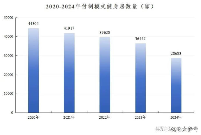 但在此后的5年里,數據證明,年付制模式的傳統(tǒng)健身房一直在降溫,從2020年的44305家跌至2024年的28683家。