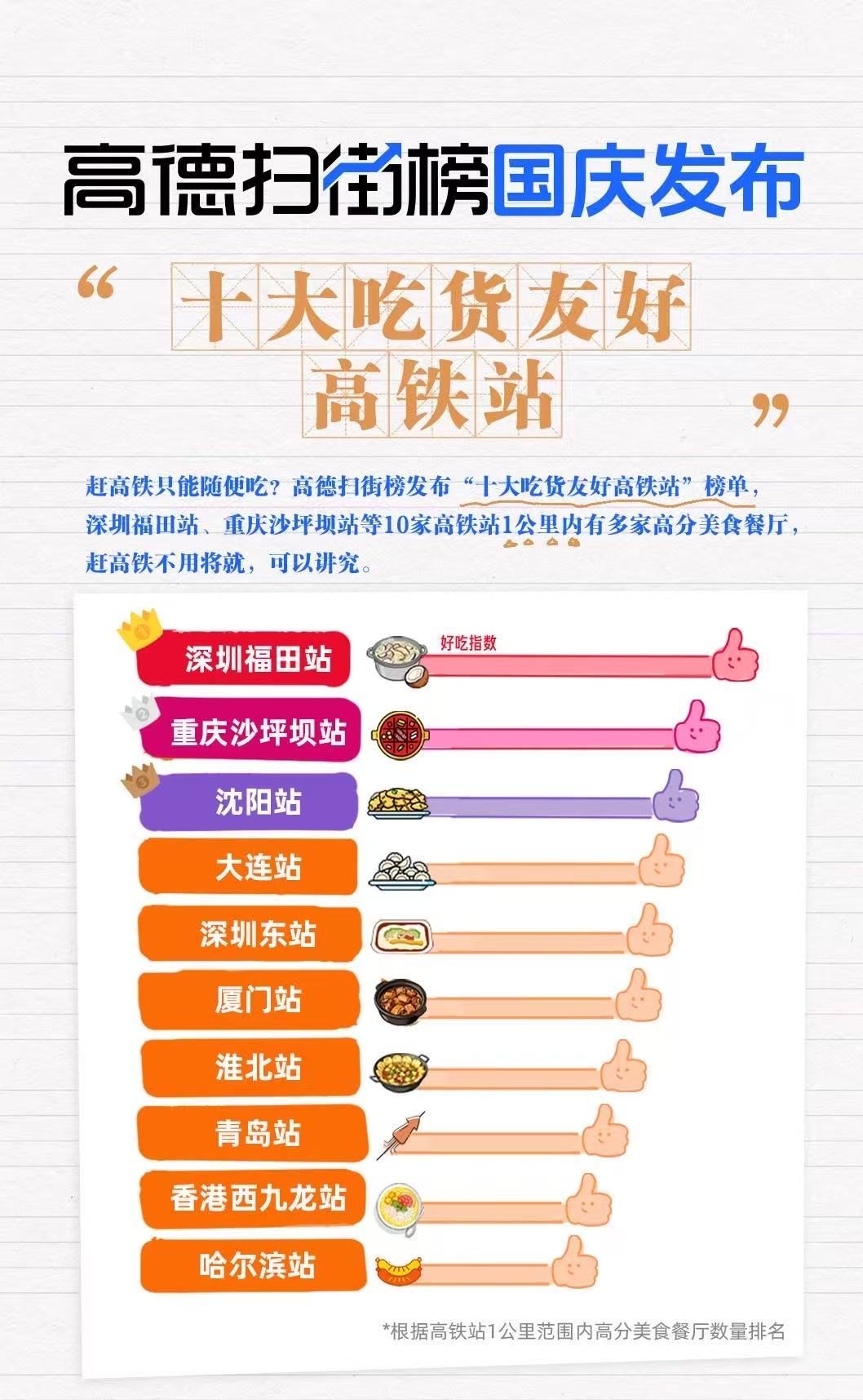 今年國慶與中秋疊加,全國鐵路預(yù)計(jì)發(fā)送旅客2.19億人次。趕高鐵的人也得吃飽吃好。筆者發(fā)現(xiàn)高德掃街榜日前發(fā)布“十大吃貨友好高鐵站”,包括深圳東站、重慶市沙坪壩站、沈陽站、大連站、廈門站、淮北市淮北站、青島站、香港西九龍站、哈爾濱站等榜上有名。