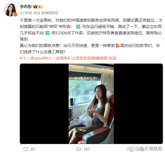 演員李若彤日前微博發(fā)文表示坐高鐵下單點(diǎn)了江西特色的南昌拌粉外賣,當(dāng)列車行駛至南昌西站時,工作人員直接將外賣送到了李若彤座位,讓她直呼服務(wù)貼心周到。