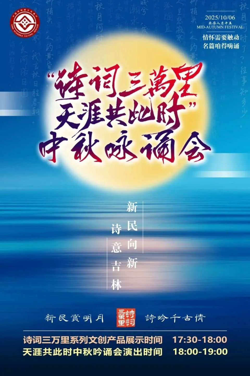 本場詠誦會將分為“月是故鄉(xiāng)明”和“天涯共此時”兩個篇章,名家們將輪番登場,或激昂、或溫婉、或深情,將詩人筆下的月色與心境一一訴說。更值得期待的是,今日17:30分,也是詩詞三萬里系列文創(chuàng)產(chǎn)品的展示時間,快去感受這份獨(dú)特文創(chuàng)產(chǎn)品的新意。