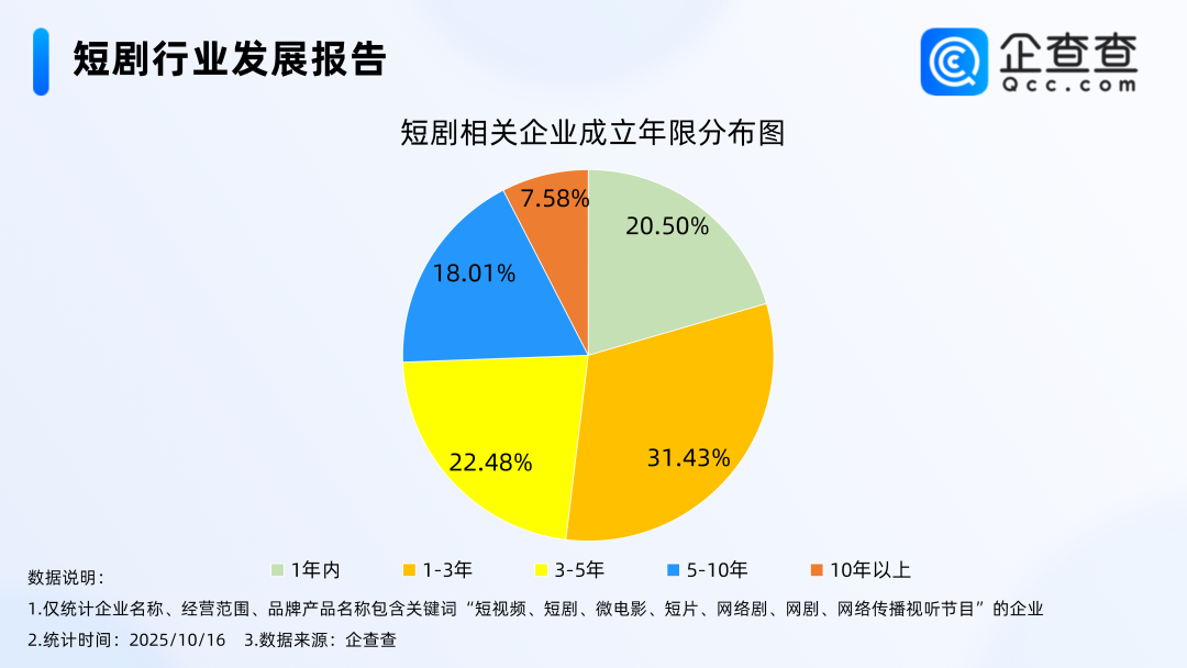 企查查數(shù)據(jù)顯示,從經(jīng)營(yíng)時(shí)間來(lái)看,成立年限在1-3年的短劇相關(guān)企業(yè)最多,占比31.43%。其次,成立年限在3-5年、1年內(nèi)的短劇相關(guān)企業(yè)分別占比22.48%、20.50%。