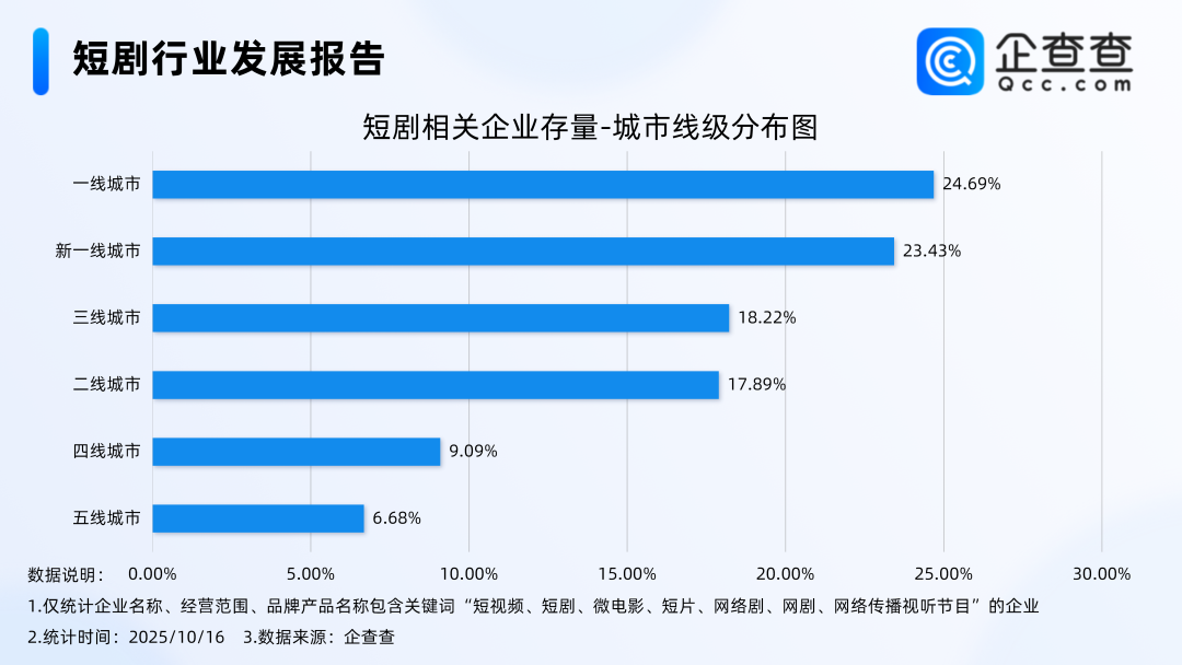 企查查數(shù)據(jù)顯示,從城市線級(jí)分布來(lái)看,分布在一線城市的短劇相關(guān)企業(yè)最多,占比24.69%。其次,分布在新一線城市、三線城市的短劇相關(guān)企業(yè)分別占比23.43%、18.22%。