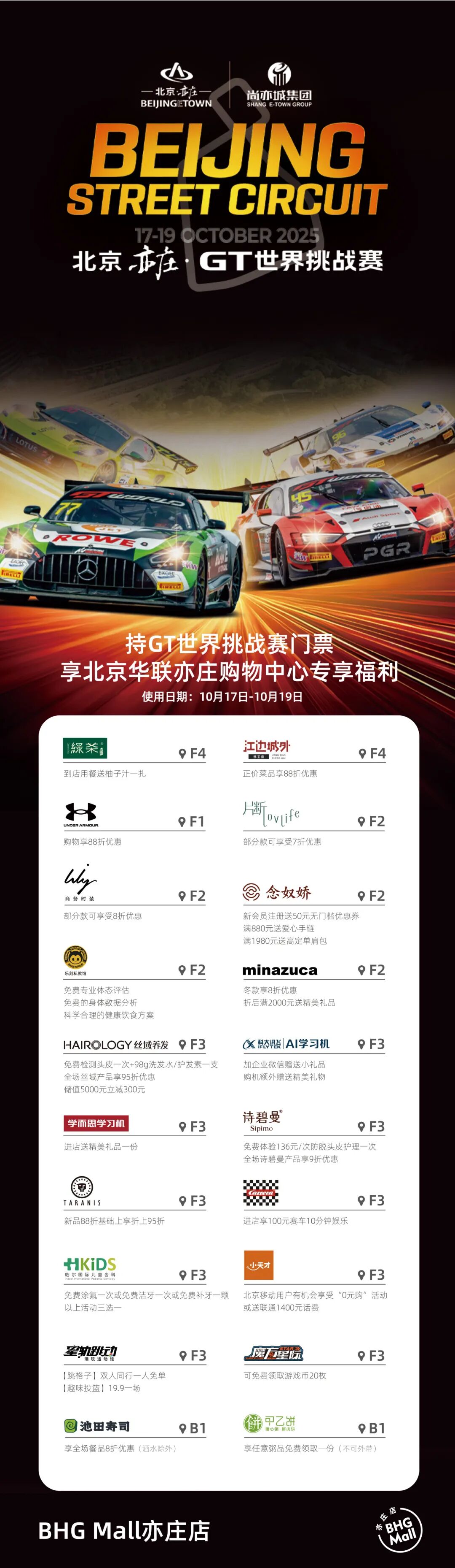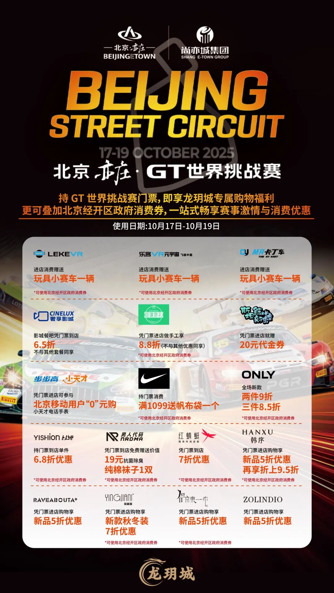 持GT賽有效票根,即可直達(dá)以下商圈兌換驚喜福利——餐飲、零售、體驗(yàn)多場(chǎng)景優(yōu)惠全涵蓋,讓賽事熱度落地成看得見(jiàn)的消費(fèi)快感!其中龍玥城、龍湖北京亦莊天街的多家店鋪,還支持使用北京經(jīng)開(kāi)區(qū)政府消費(fèi)券,福利再加碼!