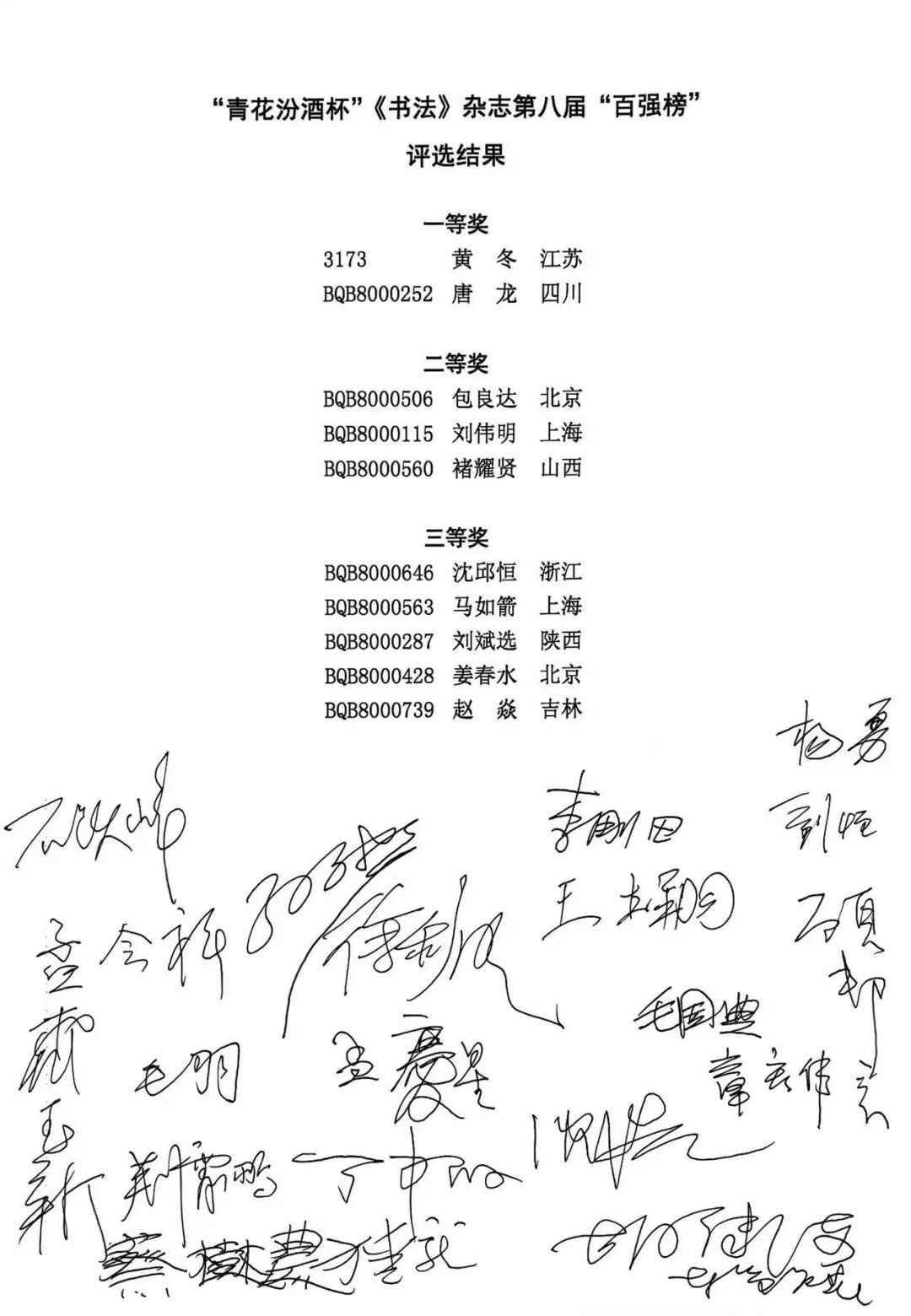 本屆“百強(qiáng)榜”復(fù)評、終評邀請包括西泠印社副社長李剛田、中國書法家協(xié)會副主席毛國典、中國美術(shù)學(xué)院副院長沈浩、上海市書協(xié)主席丁申陽、上海書畫出版社原社長王立翔、中國文聯(lián)書法藝術(shù)中心原主任、中國書協(xié)學(xué)術(shù)委員會原副主任劉恒、湖北省書法家協(xié)會主席孟慶星、《書法》雜志原執(zhí)行主編胡傳海等十位評委,并另設(shè)監(jiān)委會及學(xué)術(shù)觀察委員會對本次評審進(jìn)行巡查監(jiān)督。評審堅(jiān)持“公平、公正、公開”的評審原則,最終評選出一等獎2名、二等獎3名,三等獎5名,入選90名。