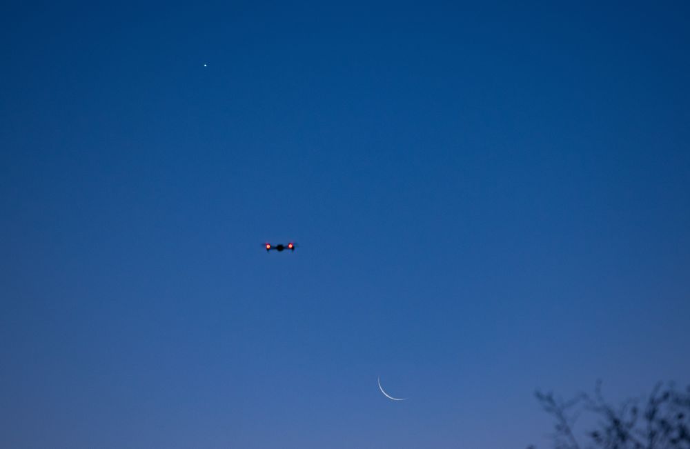 10月20日,在位于黑龍江省黑河市的北大荒集團(tuán)北安分公司趙光農(nóng)場(chǎng)有限公司,攝影愛(ài)好者在用無(wú)人機(jī)拍攝啟明星伴月。新華社發(fā)(錢(qián)泊羽攝)