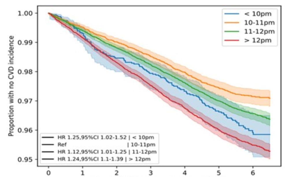 研究人員把這些人分成四組:晚上10:00 前入睡、晚上10:00~10:59入睡、晚上11:00~11:59 入睡和午夜后才入睡。然后,他們對(duì)參與者進(jìn)行了平均5.7年的隨訪,統(tǒng)計(jì)誰在這段時(shí)間里新發(fā)了心血管疾?。ㄈ缧墓?、中風(fēng)、心衰等)。