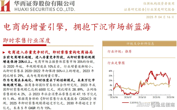 2025年4月,華西證券發(fā)布了一篇名為《即時零售行業(yè)深度:電商的增量引擎,擁抱下沉市場新藍?!返难芯繄蟾?,報告中表示,“當前電商增長趨緩(自2020年起,年規(guī)模增速在10%左右,行業(yè)增量逐漸縮?。?,進入存量競爭階段,而即時零售的規(guī)模增速保持20%以上?!?/p>