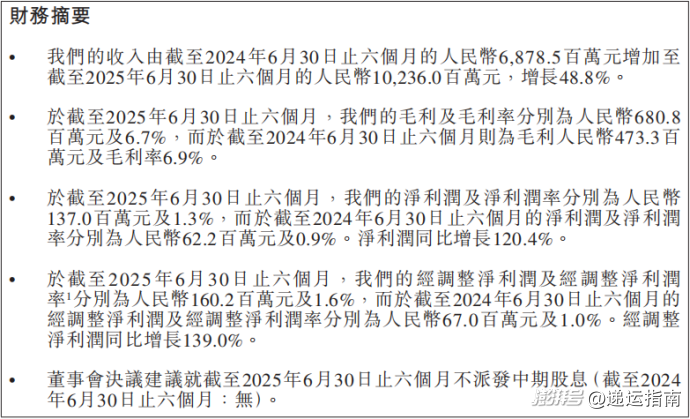 報告期內,實現收入102.36億人民幣,同比增長48.8%,據報道,這是首次實現半年度營收突破百億;凈利潤同比增長120.4%,達到1.37億人民幣;期內經調整凈利潤為1.602億人民幣,同比增長139%。