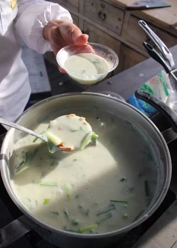粉漿飯制作時,以發(fā)酵綠豆粉漿為湯底,添入花生碎、豆干、肉丁、時蔬等豐富配料,再淋上蔥姜花椒油,慢火熬煮,有人將其稱為“北京豆汁的升級版”。