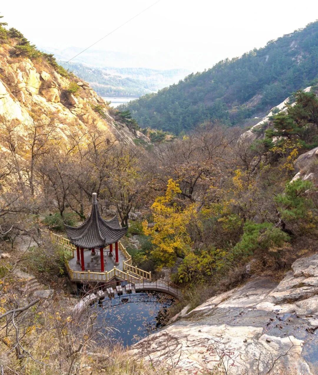 沿著古樸的木棧道與石階徐徐而上,幾座古色古香的小亭子點綴林間,雕梁畫棟構成了風景的畫框,意境悠然。
