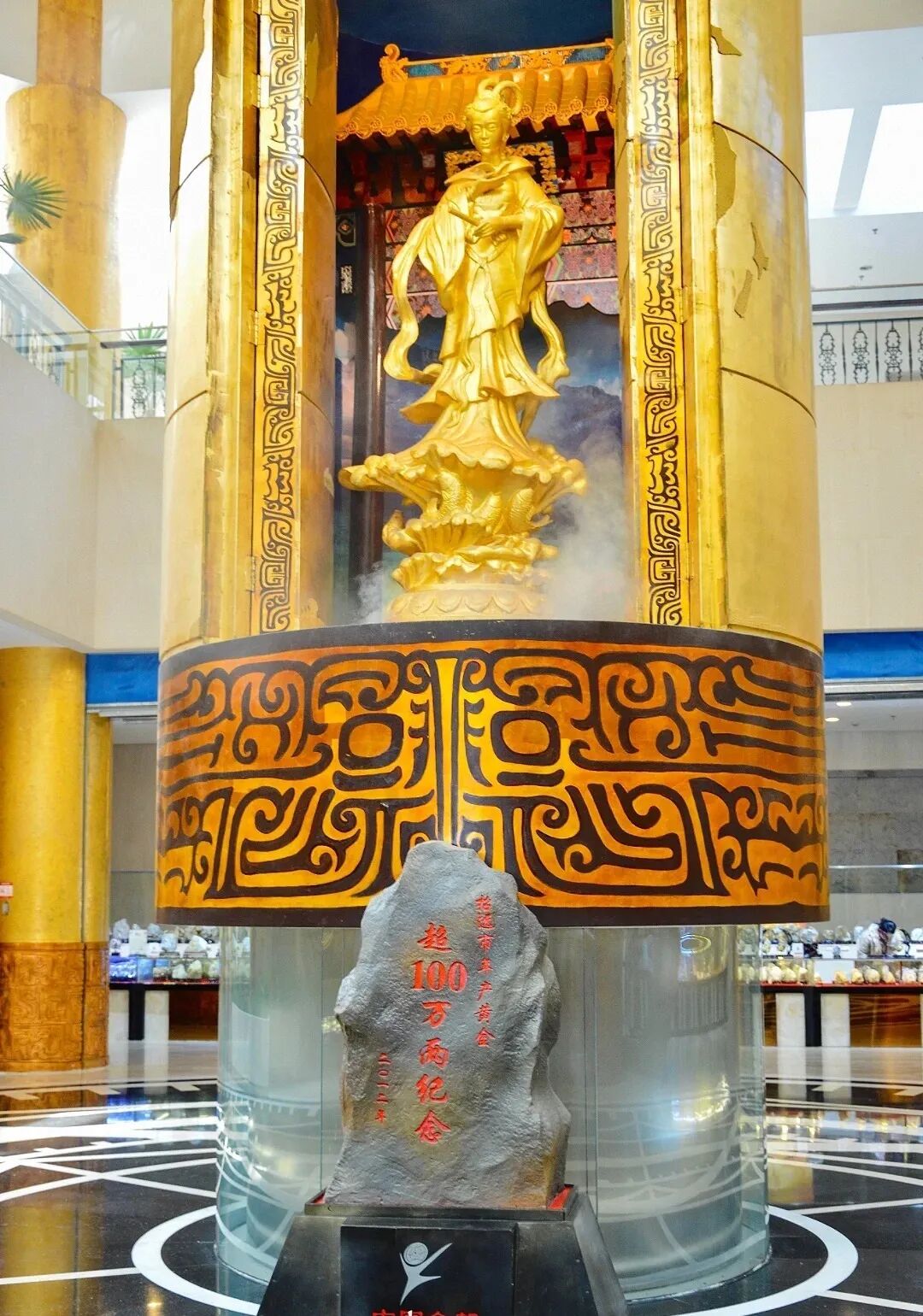 這是一座金碧輝煌的殿堂,在這里,柱子是“金子”,館中央高達12米的柱子由一萬多張金箔張貼而成。