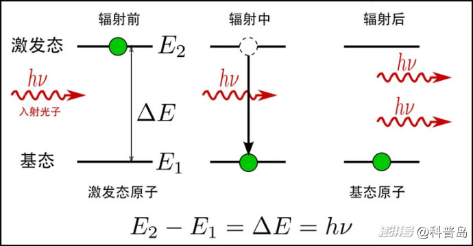 我們已經(jīng)知道,在量子理論中,原子外電子的能級都是分立的,就好像一個個臺階,每個電子都只能在“跳下”臺階時,放出臺階之差那么多能量的光子來。如果有一個電子,正在一個臺階上“猶豫”要不要往下跳,而這時有一個外來的光子,恰好帶有這么多的能量,那么這個電子就能受到這個“路過”的光子的“刺激”,立刻跳下臺階,也放出一個光子。
