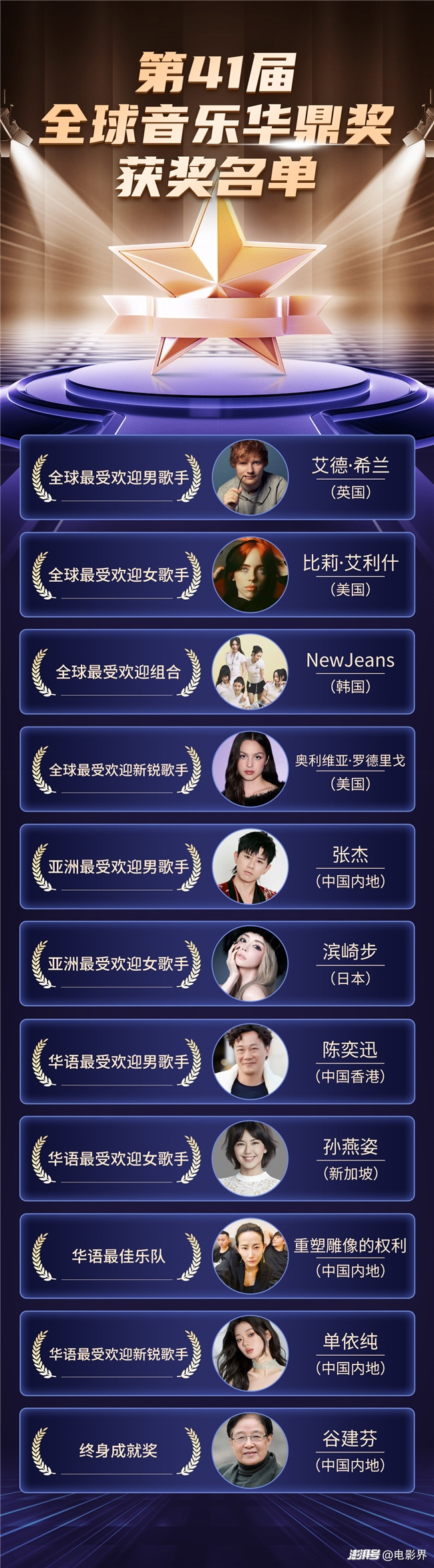 華語單元中,中國香港歌手陳奕迅憑借深厚的演唱功底與廣泛受眾基礎(chǔ),獲封華語最受歡迎男歌手,他還在2025年中央廣播電視總臺春節(jié)聯(lián)歡晚會上與奧運健兒共同演唱《孤勇者》,傳遞音樂正能量 ;新加坡歌手孫燕姿以持久的藝術(shù)生命力拿下華語最受歡迎女歌手;中國內(nèi)地樂隊重塑雕像的權(quán)利憑借獨特的音樂表達斬獲華語最佳樂隊;00后歌手單依純則以扎實的唱功與高人氣當(dāng)選華語最受歡迎新銳歌手。本屆終身成就獎授予中國內(nèi)地音樂人谷建芬,致敬其數(shù)十年深耕音樂領(lǐng)域、培育樂壇人才的卓越貢獻。