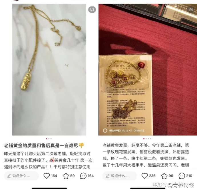 盡管老鋪黃金表示會堅持原創(chuàng)設(shè)計和產(chǎn)品迭代,但背后頻繁出現(xiàn)的質(zhì)量問題,以及一直被詬病的代工模式,似乎都與品牌宣傳的“手工匠心”模式嚴(yán)重背離。在社交媒體上,不少用戶投訴老鋪黃金的產(chǎn)品出現(xiàn)生銹變色、變形、掉鉆等問題。