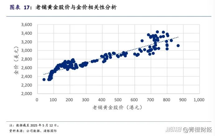 老鋪黃金這種商業(yè)模式的不確定性,也反映在公司的估值邏輯上,根據(jù)浦銀國際的研究,老鋪的股價與金價之間具有非常高的相關(guān)性。