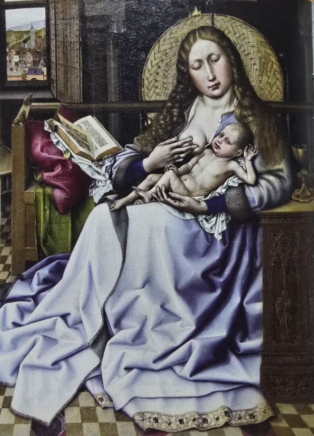 與“圖像即缺位”相對(duì)的是‘圖像即謎語(yǔ)”,曼古埃爾在對(duì)曾被歸于十五世紀(jì)荷蘭畫(huà)家羅伯特·康平(Robert Camping)或羅杰·范德·魏登(Roger van der Weyden)名下的《火障前的圣母和圣子》的解讀中,極為出色地表現(xiàn)了讀圖的細(xì)心與對(duì)圖像的解謎式追問(wèn):“相隔四個(gè)多世紀(jì),我們還能閱讀和解讀那些線索嗎?暴露的乳房,火障樣的光輪,三腳凳,她正在看的書(shū),火障背后露出的一角火苗,右手無(wú)名指上的戒指,白色長(zhǎng)裙裙擺上鑲嵌的彩色寶石,一對(duì)被裙子蓋住的神秘的八角地磚,窗外的風(fēng)景,這些元素中的每一個(gè)都在揭示她在神的世界和人的世界中應(yīng)該是誰(shuí)。我們受到了極大的誘惑,像破解謎語(yǔ)書(shū)一樣去閱讀和解讀她。”(45頁(yè))在這里首先要說(shuō)的是,能夠受到誘惑去解讀與破解謎語(yǔ),其前提是能夠在畫(huà)面上看出有需要解讀的問(wèn)題。這是由觀畫(huà)者的知識(shí)、閱歷、視覺(jué)敏感和問(wèn)題意識(shí)所決定的。