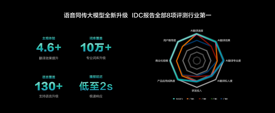 發(fā)布會現(xiàn)場演示顯示,其依托7英寸屏幕可實時呈現(xiàn)精準譯文,語音播報延遲低至約2秒,實現(xiàn)了“看見即同步”的交流體驗。這背后是訊飛語音同傳大模型的全棧能力支撐。據(jù)IDC報告,訊飛在AI翻譯全部8項評測中位列領先。