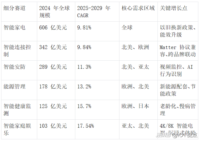 從產(chǎn)品維度看,全球智能家居市場已形成六大細分領(lǐng)域,其增長潛力與區(qū)域適配性呈現(xiàn)明顯差異: