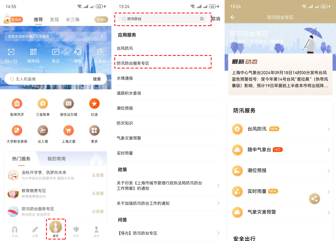 登錄“隨申辦市民云”APP→首頁輸入框中輸入關鍵字“防汛防臺”→點擊“防汛防臺服務專區(qū)”進入服務頁面,即可查看臺風資訊、實時雨量、道路積水、全市緊急避難場所、防災知識等多類安全信息,幫助市民在遇到困難時可以從容應對。