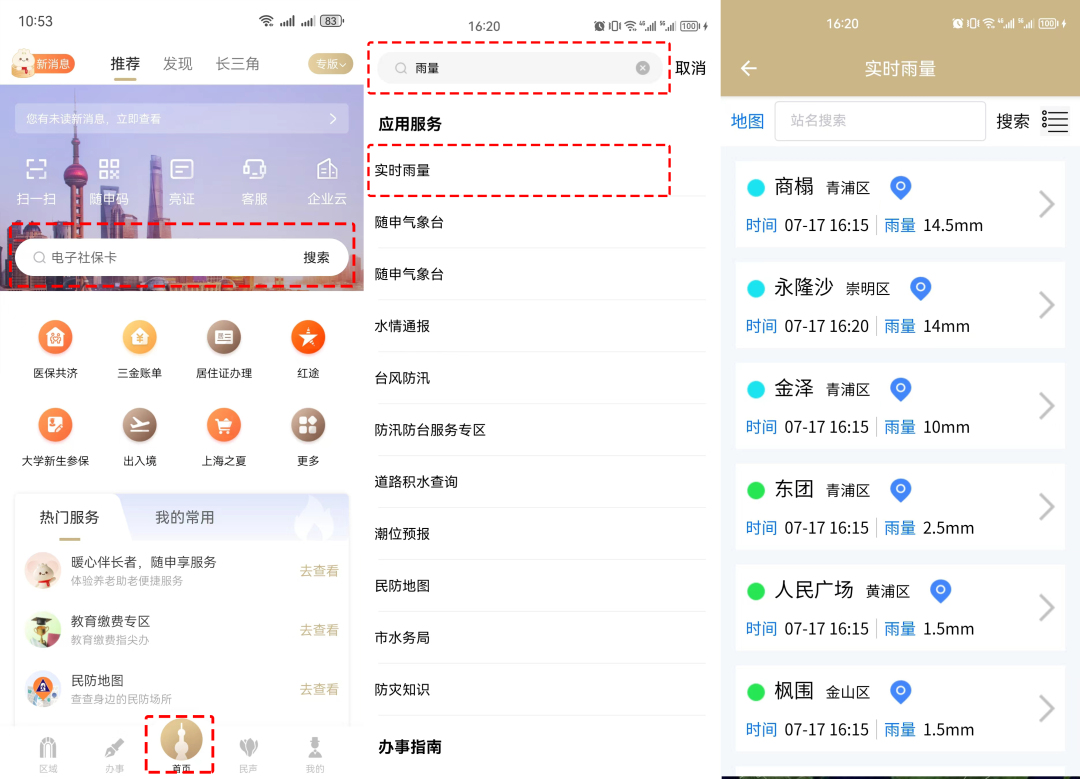 上“隨申辦市民云”APP的“實時雨量”服務,上海全市雨量實時知曉!