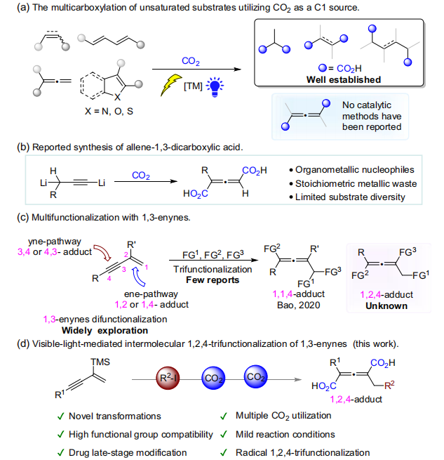 近日,蘭州大學科研團隊在可見光催化領(lǐng)域取得重要進展,開發(fā)了一種條件溫和、無需金屬氧化劑的三組分反應(yīng)新方法,首次實現(xiàn)了以CO2與甲酸鹽作為雙碳源,對1,3-烯炔進行精準的1,2,4-三官能團化,高效合成具有軸手性潛力的1,3-聯(lián)烯二羧酸類化合物。