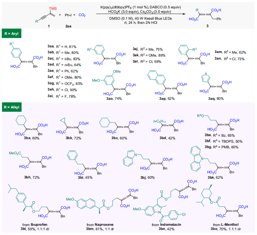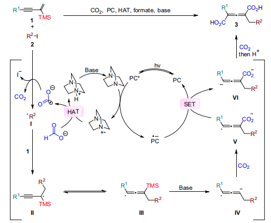 針對這一挑戰(zhàn),研究團隊創(chuàng)新性地提出在1,3-烯炔的C2位引入三甲基硅基(TMS)作為可離去導(dǎo)向基團。在可見光激發(fā)下,甲酸鹽產(chǎn)生的二氧化碳自由基負離子(CO2??)首先將碘化物還原成碳自由基,實現(xiàn)對1,3-烯炔的自由基加成形成關(guān)鍵的自由基中間體,隨后在堿促進下TMS脫除,生成高反應(yīng)活性的聯(lián)烯自由基負離子,進而精準捕獲兩分子CO2,最終實現(xiàn)了在C2與C4位點同時引入羧基的1,2,4-三官能團化過程。該策略巧妙利用了TMS的電子與空間效應(yīng)調(diào)控反應(yīng)路徑,并使甲酸鹽同時扮演還原劑與輔助碳源的角色,整個過程無需外加金屬氧化劑,體現(xiàn)了綠色合成的理念。