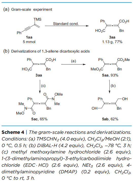 該方法的合成實用性在克級規(guī)模實驗中得到了驗證,以77%的收率成功獲得1.13克產(chǎn)物。此外,所得1,3-聯(lián)烯二羧酸可進一步衍生為二酯、二醇以及Weinreb酰胺等多種高價值中間體,為后續(xù)功能分子的構(gòu)建提供了模塊化工具。