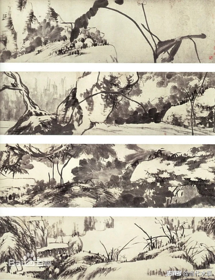 他的山水畫多取荒寒蕭疏之景,剩山殘水,營造出滿目凄涼、枯索冷寂的意境 。這種構(gòu)圖反映了他孤憤的心境和堅(jiān)毅的個(gè)性,也暗喻著明亡后山河破碎的歷史現(xiàn)實(shí) 。如《秋林亭子圖》中荒寒蕭瑟的構(gòu)圖,既是明亡后山河破碎的隱喻,也是禪宗"空寂"境界的投射 。