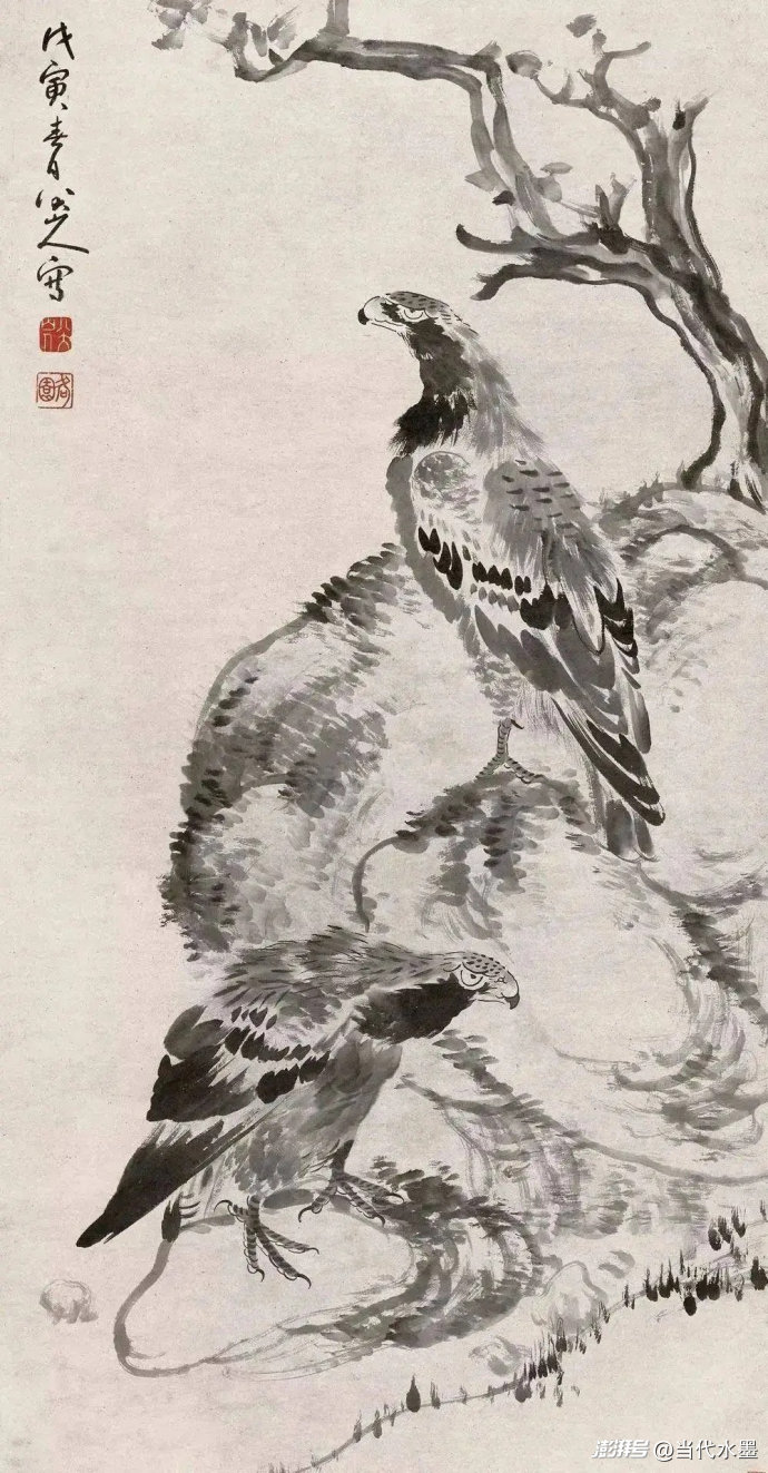 八大山人筆下的魚、鳥、鴨等動(dòng)物,常以白眼向天的姿態(tài)出現(xiàn),充滿倔強(qiáng)之氣 。這種形象正是朱耷自我心態(tài)的寫照,象征著遺民面對現(xiàn)實(shí)的不合作態(tài)度與孤傲精神 。如《荷花水鳥圖》中孤鳥白眼向天,象征不與清廷妥協(xié)的孤傲 ;《雙鷹圖》中鷹的眼神看似岔開,實(shí)則構(gòu)建了一種時(shí)空中的多維狀態(tài),體現(xiàn)了"冷眼觀世"的遺民立場 。