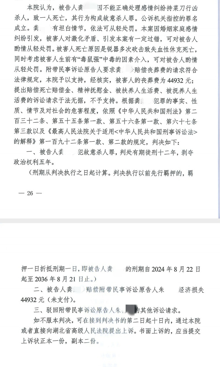 法院判決龔某珍故意殺人罪有期徒刑12年,剝奪政治權(quán)利五年,賠償刑附民原告人小朱44932元。