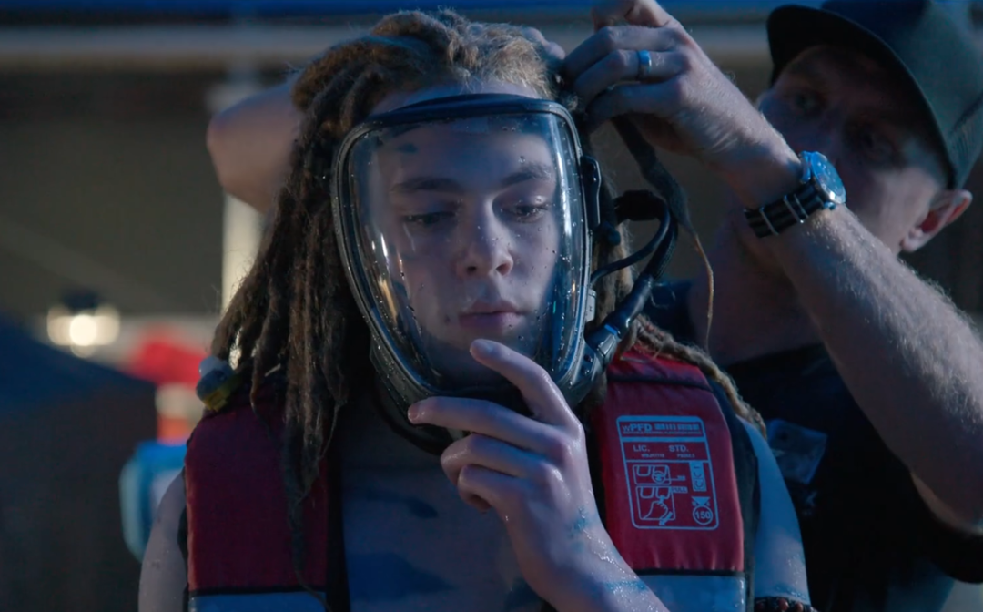 此外,針對無法憋氣的少年角色“蜘蛛”,團隊還專門設計并制造了一款功能完備的全罩式呼吸面罩。它不僅要保證演員杰克·尚皮永的安全,解決二氧化碳堆積問題,還要確保其整個面部表情能被清晰地看到和捕捉,甚至內(nèi)置了麥克風以便與導演溝通。
