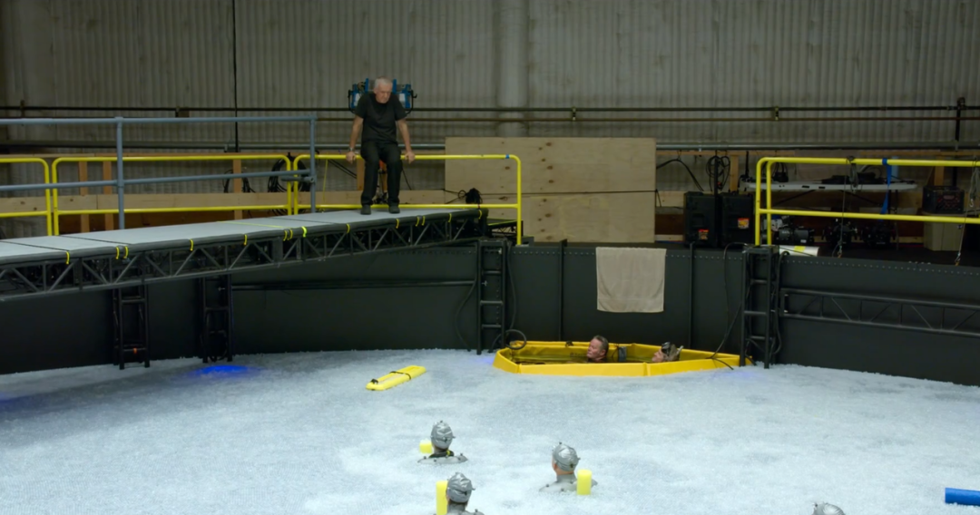 為了模擬海洋的動態(tài),團隊設計了一臺由重達20噸的鋼板驅動的巨型波浪機,它能制造出高達數(shù)英尺的平緩“涌浪”,讓演員和載具能像在真實海面上一樣自然起伏。