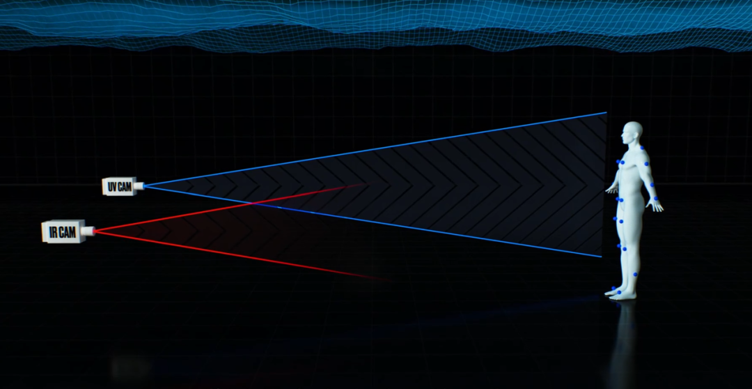 為此,團隊創(chuàng)造了一個匪夷所思的“雙層虛擬攝影棚”:上層空間(空氣中)使用傳統(tǒng)的紅外攝影機系統(tǒng);下層空間(水中)使用新開發(fā)的紫外線攝影機系統(tǒng)。