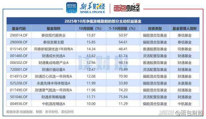 根據(jù)不完全統(tǒng)計,2025年10月,共有80余只主動權(quán)益基金收益率超過5%,來自泰信基金、同泰基金、財通基金等機構(gòu)。其中,11只基金10月凈值上漲超過10%。