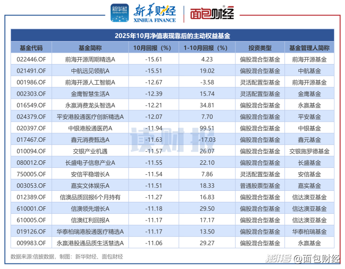 前海開源基金、中航基金等旗下30余只主動權(quán)益基金10月凈值下跌超過10%,表現(xiàn)相對落后。