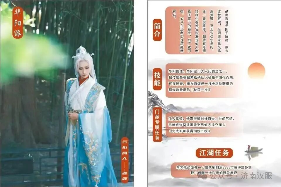 技能:華陽(yáng)劍法,華陽(yáng)宮門人入門劍法之一,據(jù)傳就是根據(jù)赤松子仙人秘籍中演化而來,可在投壺、捶丸兩處任一打卡點(diǎn)位獲得的銅錢數(shù)量翻倍(僅限一次)