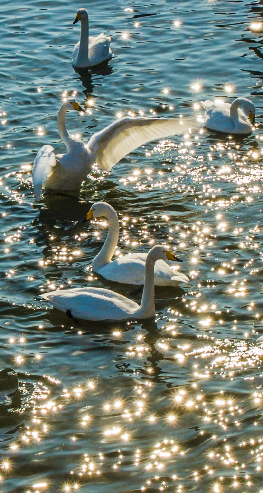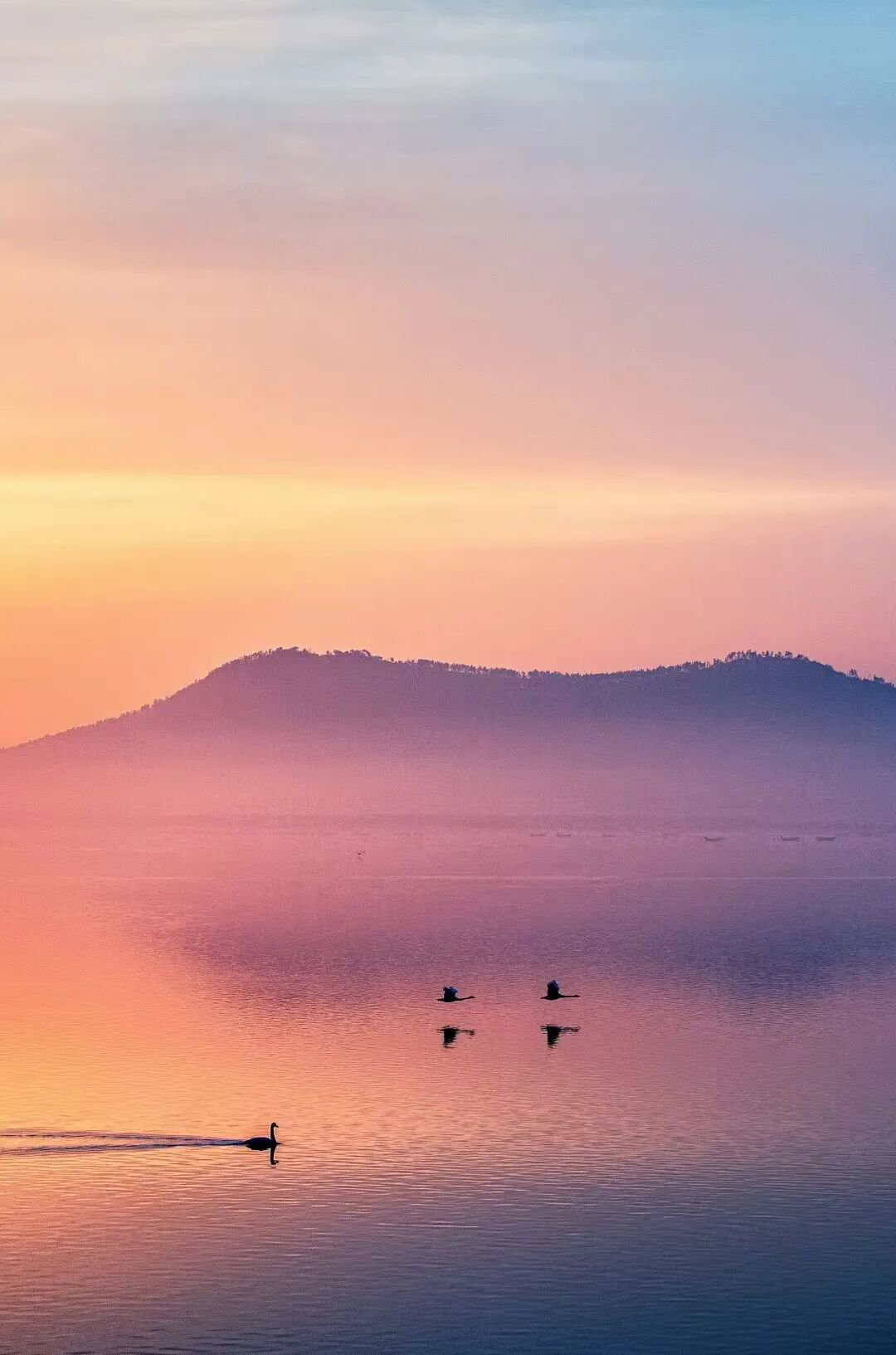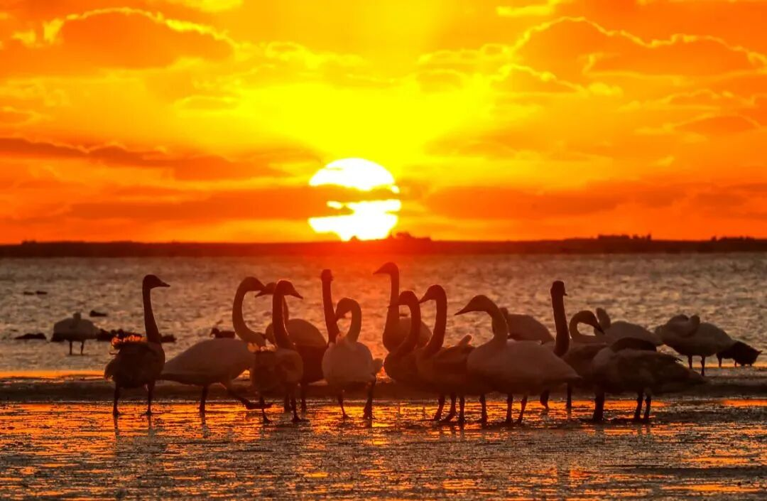 保護區(qū)內,天鵝們或悠然游弋,或引頸高歌,或展翅練習,每一個動作都充滿優(yōu)雅的韻律感。日落時,湖面染上金光,天鵝點綴其中,如同一幅水墨畫。
