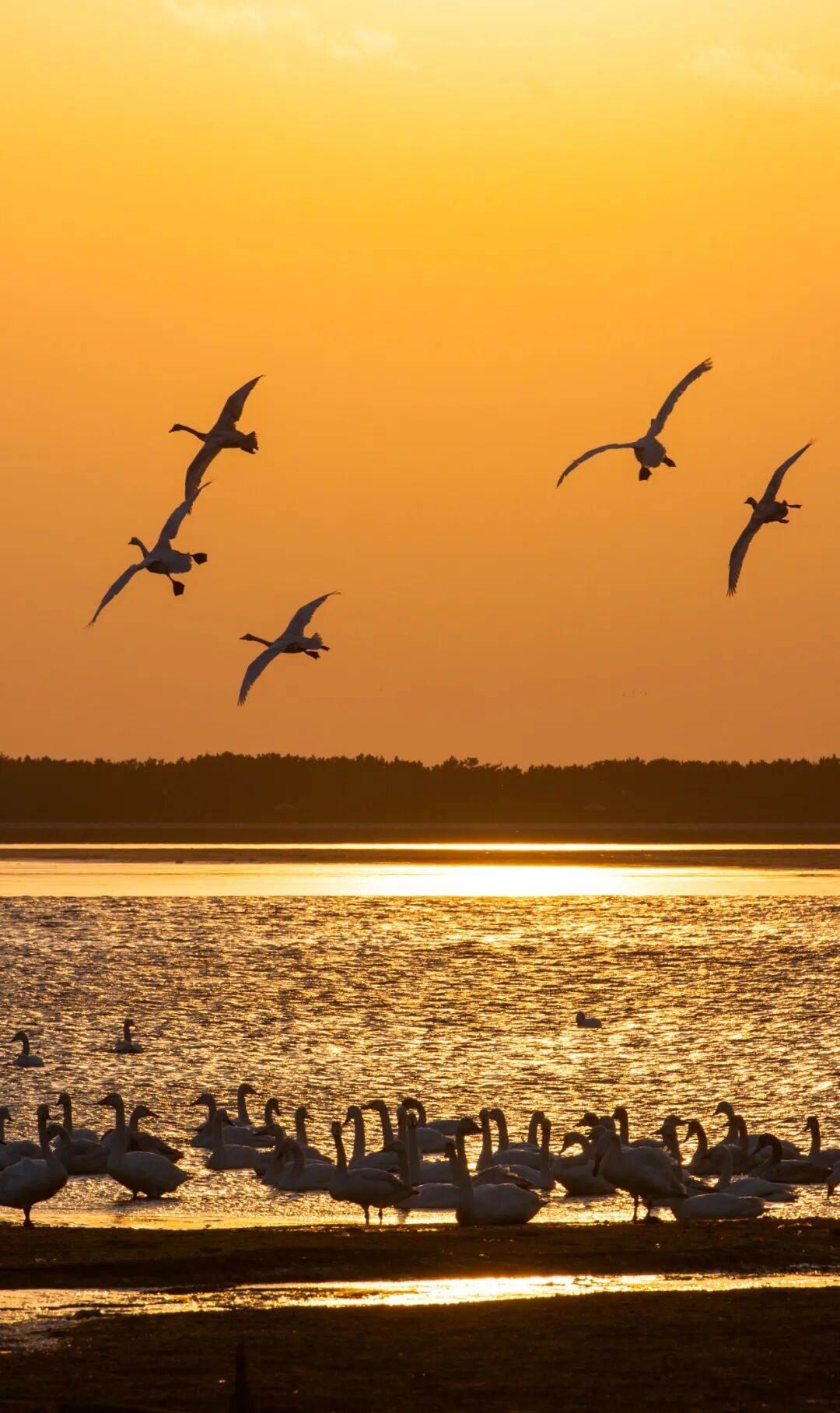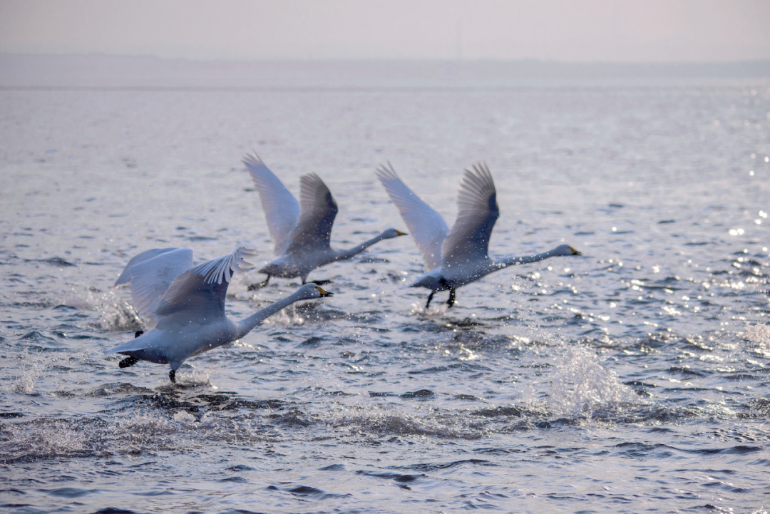 這里不僅離天鵝更近,更是看日出的好地方,東方既白,金色的陽光穿透晨霧,成群的天鵝在暖色調的湖面上振翅起飛,翅膀拍打水面的聲音與清脆的鳴叫聲交織成冬日最動人的交響樂。