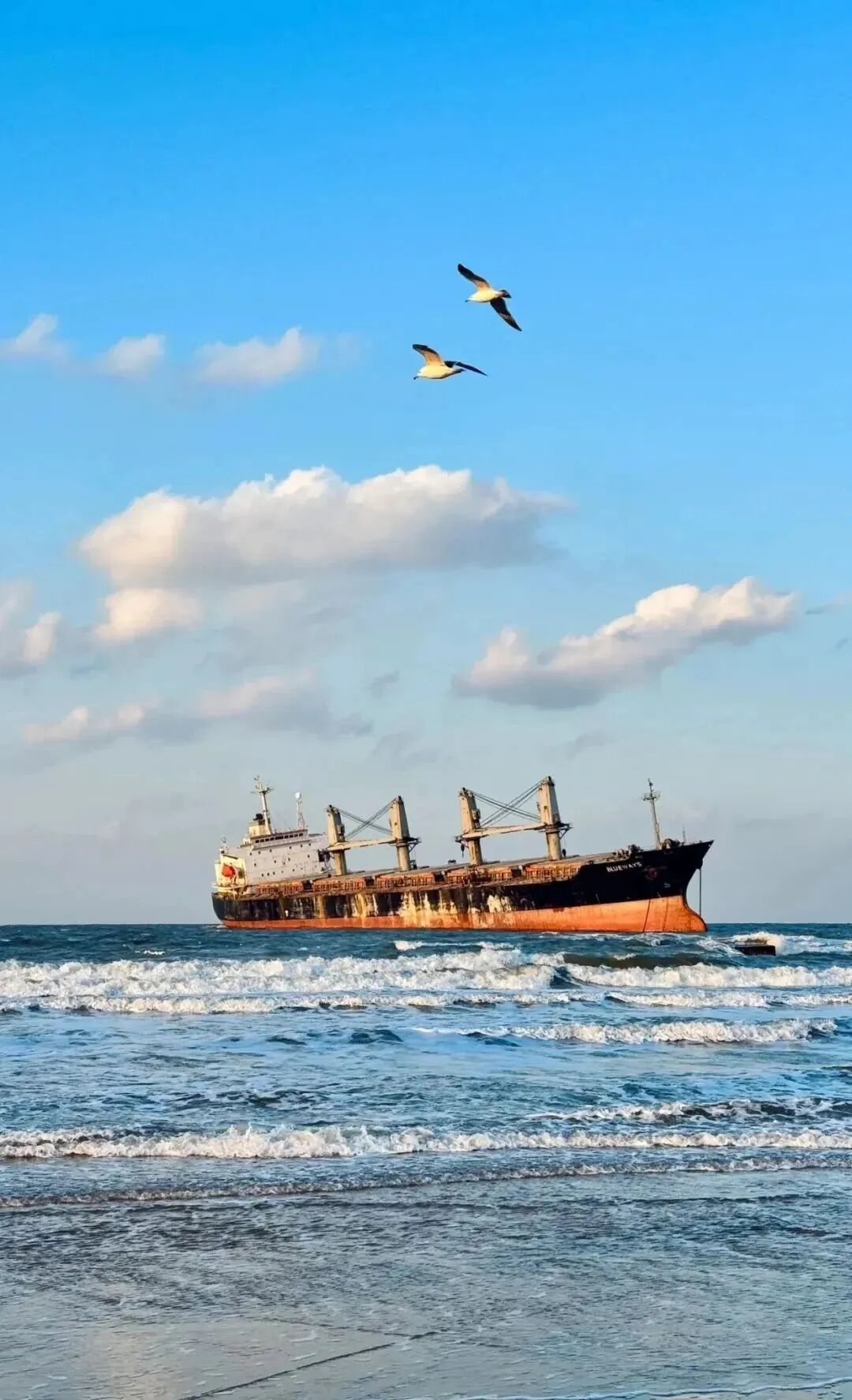 這艘身長百米的沉船,船舷爬滿斑駁的紅褐色鐵銹,船身斜倚在碧浪里,在海鷗的環(huán)繞下更顯得孤寂與浪漫。