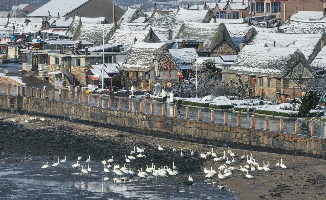 這里不僅有天鵝,還有膠東地區(qū)特有的海草房——這些頂著厚厚“草帽”的古老民居,與湖中的天鵝構成了一種奇妙的時空對話。