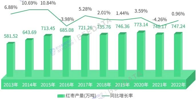 國家統(tǒng)計局數(shù)據(jù)顯示,2022年,中國紅棗產(chǎn)量為747.24萬噸;與2013年相比,中國紅棗產(chǎn)量增長了165.72萬噸,增幅約為28.5%,年均復合增長率約為2.83%。