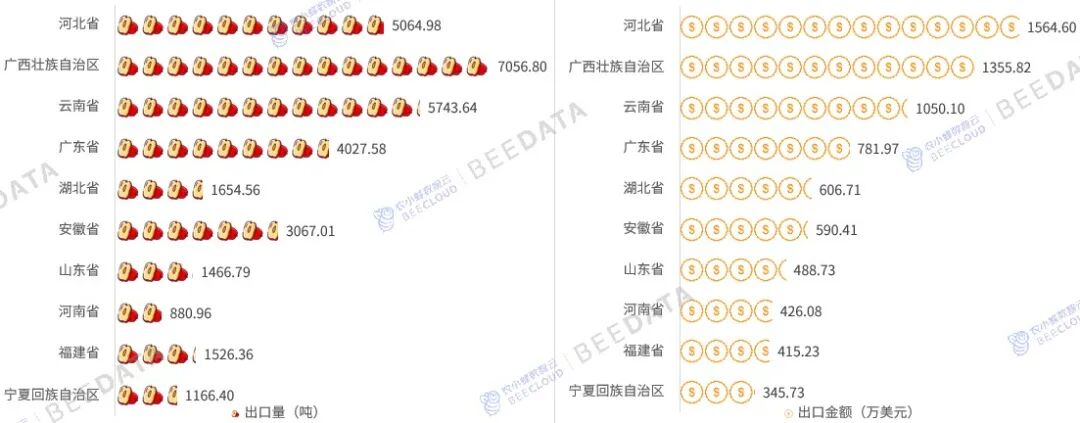 2024年,通過河北、廣西、云南出口銷往國際市場的紅棗出口量均在5000噸以上,出口金額均在1000萬美元以上;