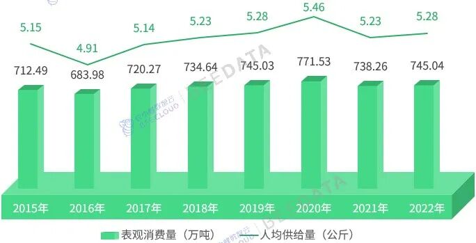 2015年至2022年,中國紅棗表觀消費量從712.49萬噸波動增長至745.04萬噸,增長了32.55萬噸,增幅約為4.57%;